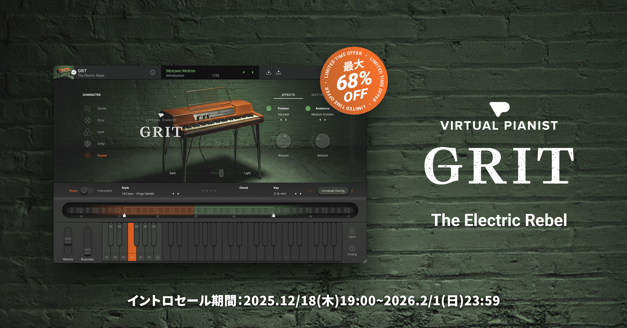 キャラクターを選択するだけで、完璧にエンジニアリングされたピアノサウンドが手元に。スタイルやフレーズと組み合わせれば、ピアノ演奏スキルがなくてもフローを止めずに、素早く賢くプロデュースすることができます。