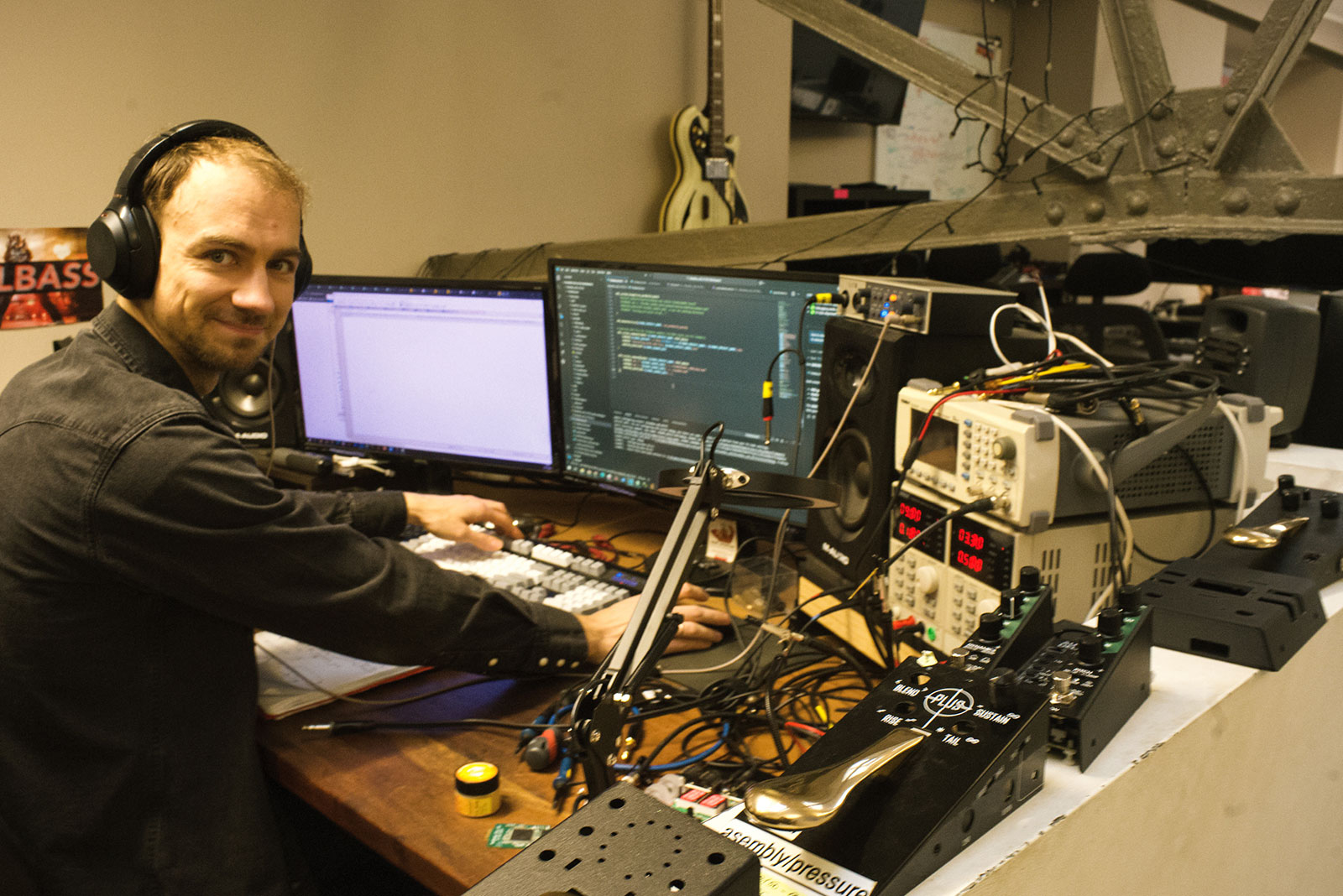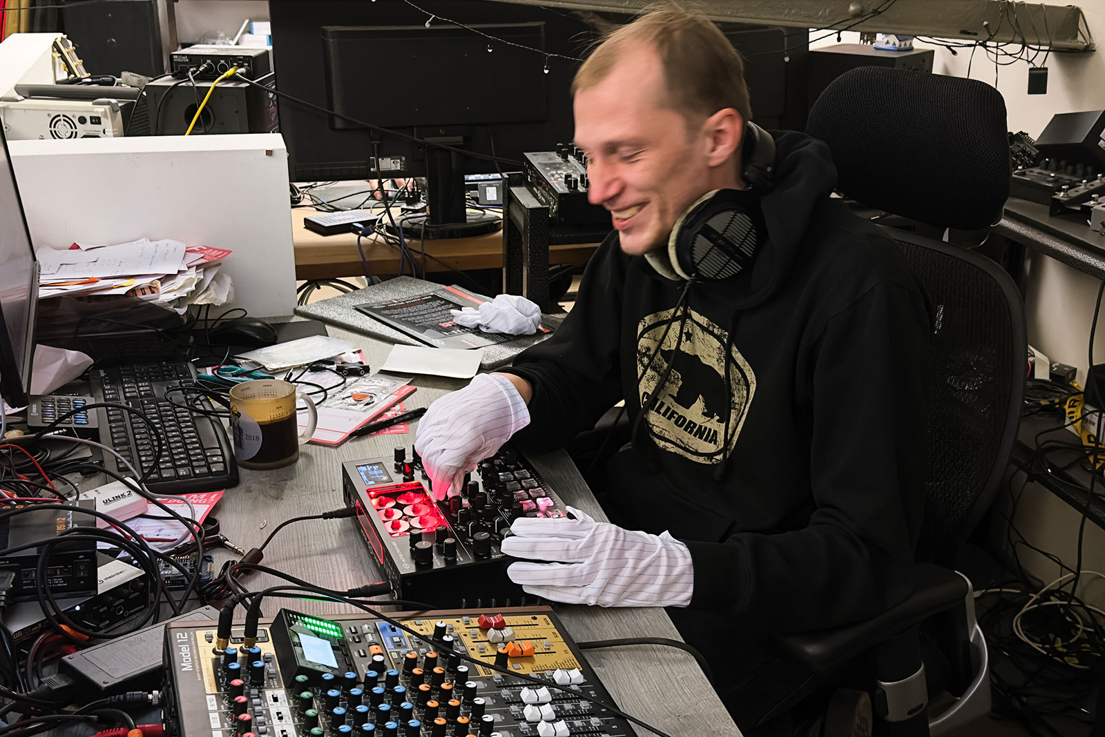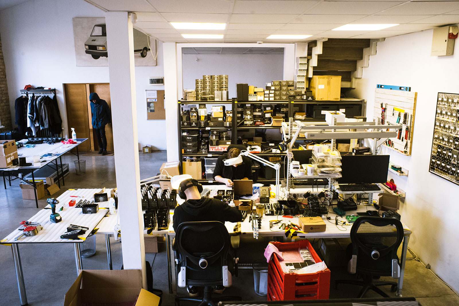 スタッフの1人、Karlis。“Motor Synth Mk II”のチェックなどを行なっているようだ。