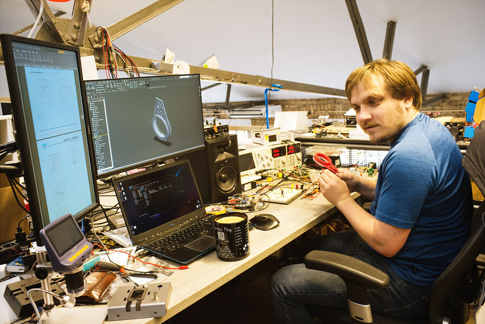 スタッフの1人、Valters。ゲームチェンジャー・オーディオ製品のユニークなデザインは、3Dモデリングなども大活躍しているようだ。