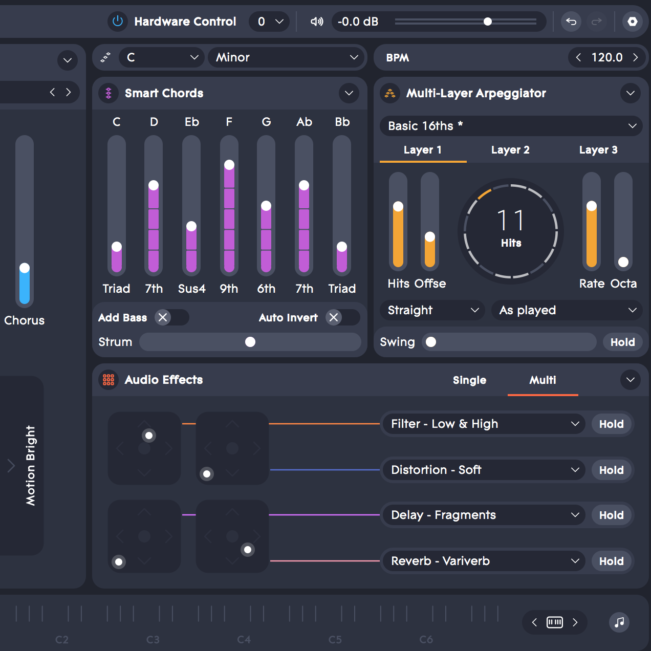 それにより、まるで実際にアコースティック楽器を演奏しているかのようなフィーリングを生み出します。指を揺らしたり、押し込んだり、緩めたりといった、体の微妙な動きにも複数ノートに対し有機的に、同時に追従することが可能です。