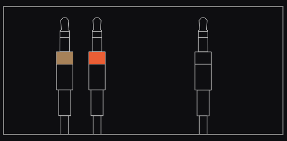 OP–XY は tip に cv、ring に gate を出力するため、ノートとトリガーを分離するにはスプリッターケーブルが必要です。単一のステレオではなく、左(tip)と右(ring)の信号に分離するタイプのケーブルを使用してください。アナログシンセによっては 6.35mm ジャックを必要とし、eurorack などでは3.5mm の場合もあるため、両端に適切なサイズを使用してください。
