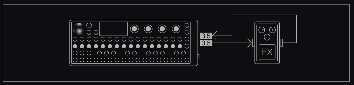 一部の FX ユニットやペダルは 6.35mm 入力を使用するため、3.5mm から対応の規格へ変換できるケーブルを使用してください。3.5mm 側を OP–XY の multi-out ポートに、反対側を FX ユニットまたはペダルの入力に接続します。同様のケーブルを使って、FX ユニットの出力から OP–XY の audio input へ接続します。