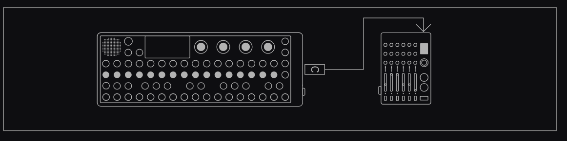 これで OP–XY は multi-out ポートから sync を出力しますが、多くのヴィンテージ・ドラムマシンは DIN sync ケーブルで sync を受け取るため、3.5mm to DIN sync 変換ケーブルが必要になります。